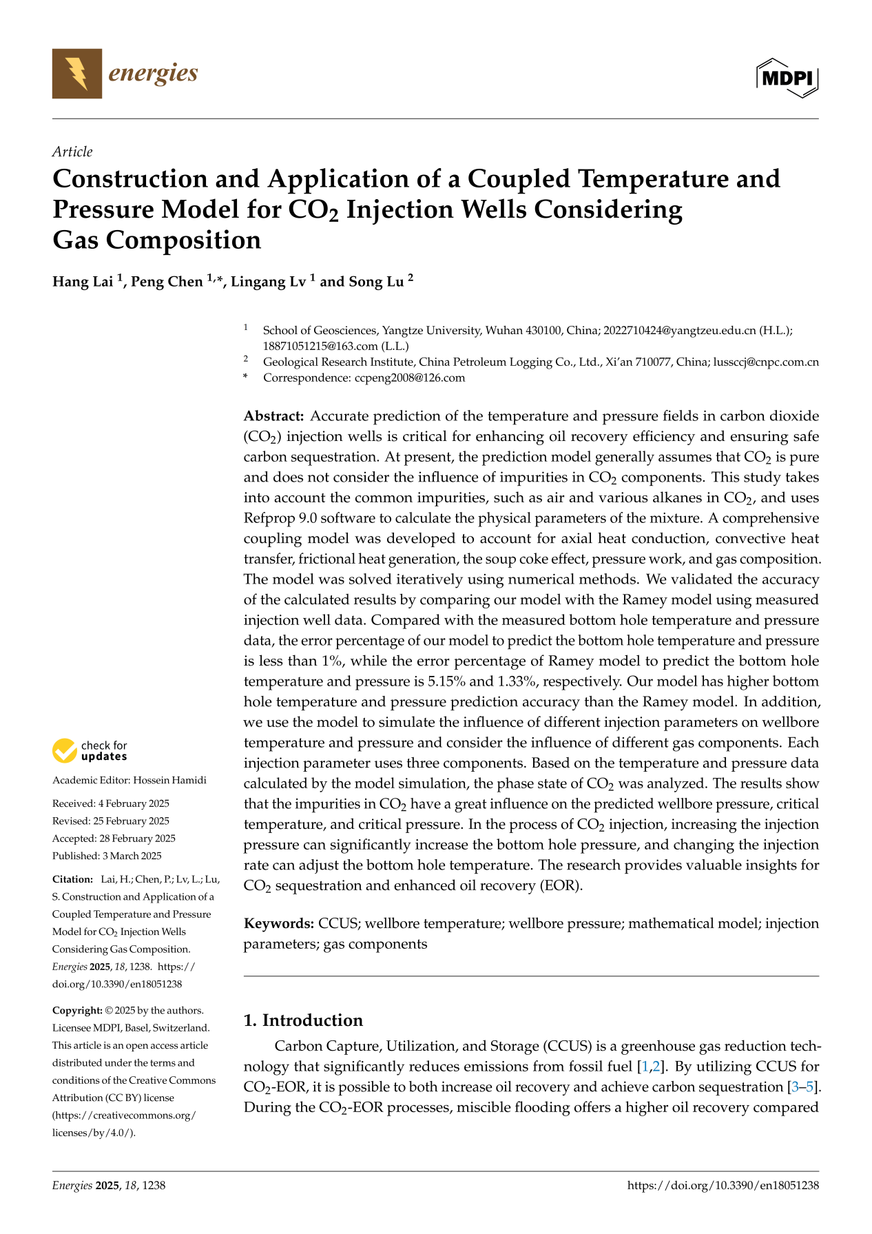 硕士生来航在SCI收录期刊《Energies》发表题为“Construction and Application of a Coupled Temperature and Pressure Model for CO2Injection Wells Considering Gas Composition”的研究论文。日本无码av