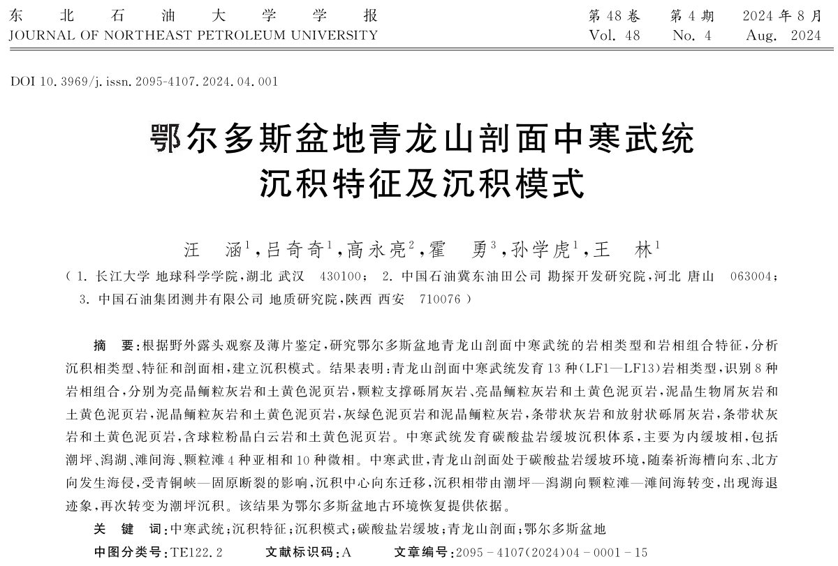 22级硕士研究生汪涵在《东北石油大学学报》上发表题为“鄂尔多斯盆地青龙山剖面中寒武统沉积特征及沉积模式”的研究论文,日本无码av