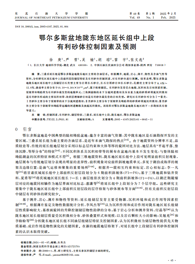 硕士生徐庚在《东北石油大学学报》上发表题为“鄂尔多斯盆地陇东地区延长组中上段有利砂体控制因素及预测”的研究论文。日本无码av