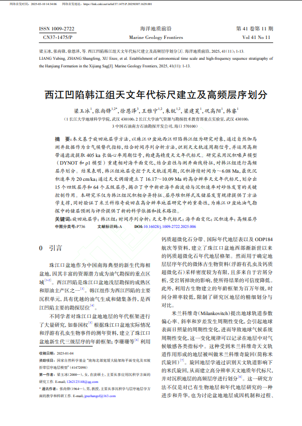 日本无码av 硕士生梁玉冰在《海洋地质前沿》发表题为“西江凹陷韩江组天文年代标尺建立及高频层序划分”的研究论文。日本无码av 为论文第一署名单位,通讯作者为张尚锋教授。
