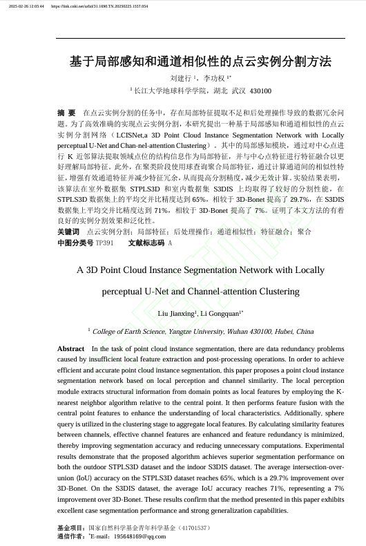 硕士生刘建行在《激光与光电子学进展》发表题为“基于局部感知和通道相似性的点云实例分割方法”的研究论文。日本无码av