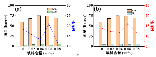 图3不同气体分离膜的气体分离性能(a)CO2/CH4体系(b)CO2/N2体系