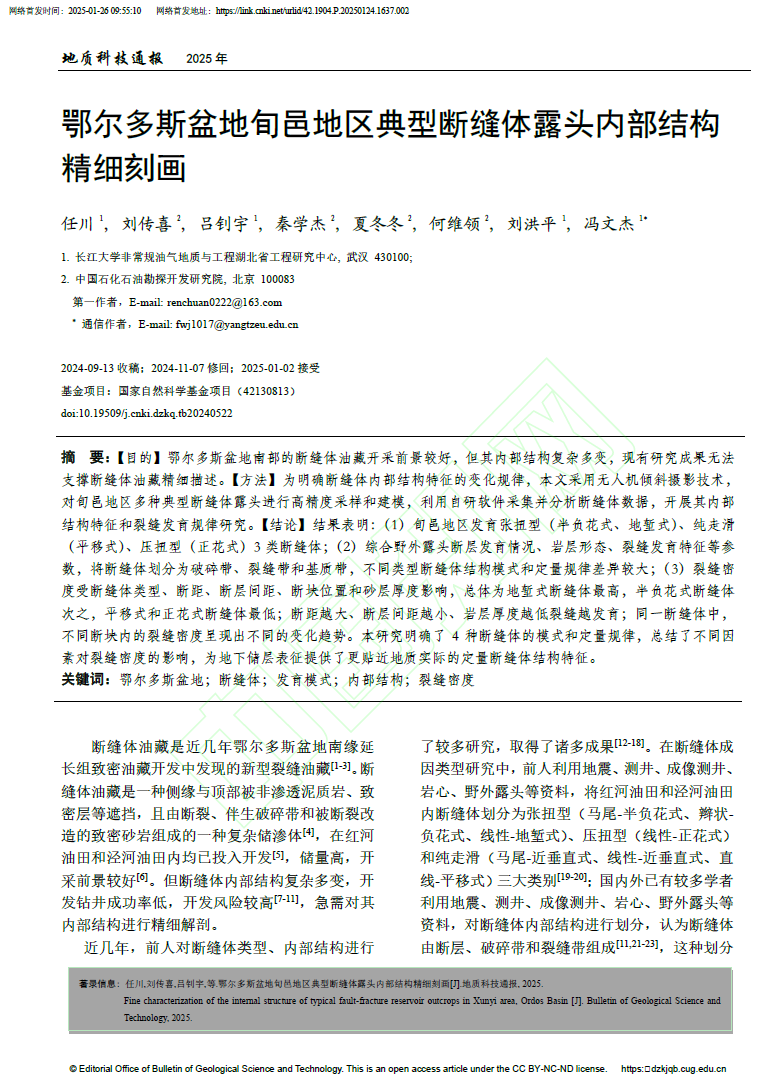 该文通过人工测量和无人机测绘相结合的方法,系统采集了鄂尔多斯盆地南部旬邑地区延长组长8段典型断缝体野外露头,并结合前人研究成果,对研究区断缝体内部结构进行精细刻画。
