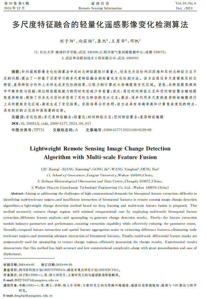 地图制图学与地理信息工程专业2022级硕士生刘子阳在中文核心期刊《遥感信息》发表题为“多尺度特征融合的轻量化遥感影像变化检测算法”的研究论文。日本无码av