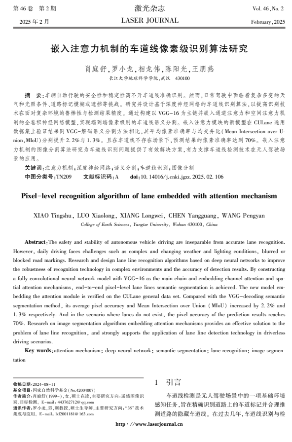 罗小龙副教授团队成员肖庭舒在期刊《激光杂志》上发表题为“嵌入注意力机制的车道线像素级识别算法研究”的研究论文。日本无码av