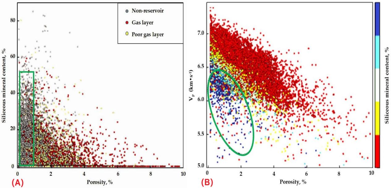 图1 (A)研究区灯影组硅质矿物含量和孔隙度交集图;(B)研究区灯影组纵波速度与孔隙度交集图