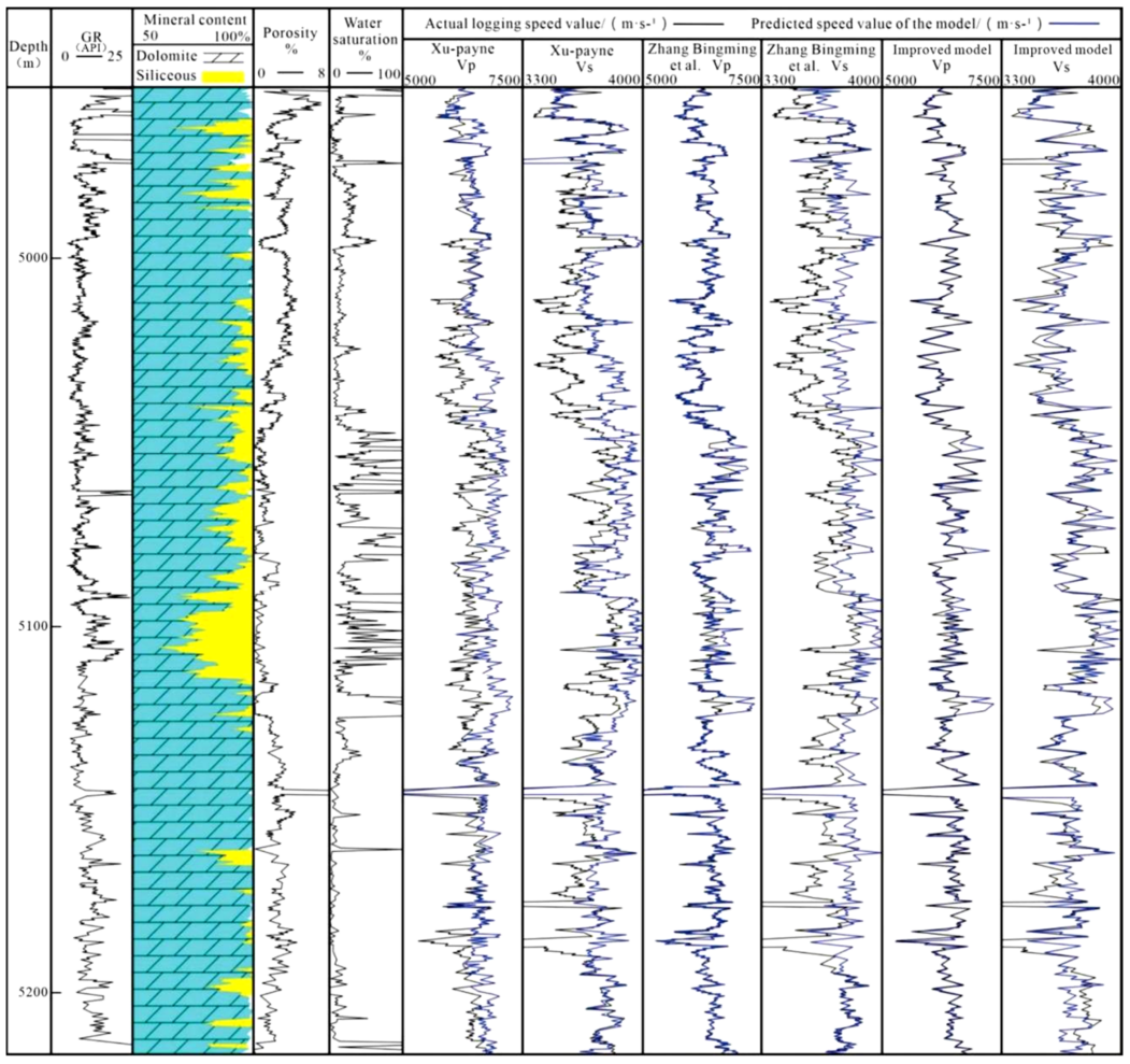 该研究选取四川盆地高石梯—磨溪地区灯影组为研究对象,通过灯影组岩石物理参数和孔隙交集图,表明硅质白云岩与储层具有低阻抗特性,导致储层表征和预测困难(图1),横波速度有利于储层表征。目前,用于估计横波速度的主要方法是岩石物理建模,可建立储层弹性参数和物理参数之间的关系。本文将研究区白云岩中的硅质矿物视为固体包裹体,采用固体置换法改进了岩石基质模量的计算方法,通过结合 KT(Kuster-Toksöz)模型、DEM (离散元法) 模型、Gassmann方程和 Wood方程构建改进的岩石物理模型(图2)。在纵波速度的约束下,使用改进的模型估计横波速度,改进模型得到的横波速度曲线的形状以及与实测速度的偏差明显优于 Xu-Payne模型和其他模型。结果表明:改进后的模型能够有效估计该区域储层的横波速度,为该区域未来储层预测提供依据(图3)。