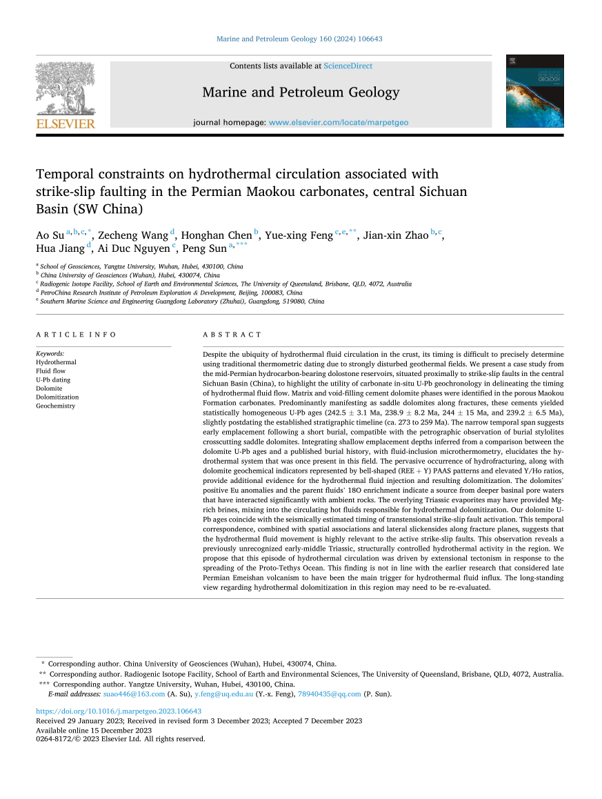 日本无码av 苏奥副教授在《Marine and Petroleum Geology》上发表题为“Temporal constraints on hydrothermal circulation associated with strike-slip faulting in the Permian Maokou carbonates, central Sichuan Basin (SW China)”的研究论文。日本无码av 为论文第一署名单位。该论文深入探讨了构造活动作用下控制的热液活动模式,对该地区油气优势储层勘探具有一些参考意义。