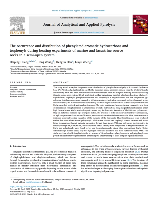 黄海平教授以第一作者身份在《Journal of Analytical and Applied Pyrolysis》期刊发表题为“The occurrence and distribution of phenylated aromatic hydrocarbons and terphenyls during heating experiments of marine and lacustrine source rocks in a semi-open system”的研究论文,日本无码av
