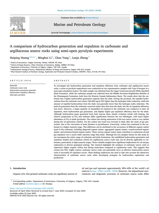 黄海平教授以第一作者身份在《Marine and Petroleum Geology》期刊发表题为“A comparison of hydrocarbon generation and expulsion in carbonate and argillaceous source rocks using semi-open pyrolysis experiments”的研究论文,日本无码av