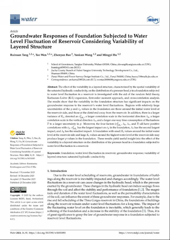 教师唐睿旋在《WATER》上发表题为“Groundwater Responses of Foundation Subjected to Water Level Fluctuation of Reservoir Considering Variability of Layered Structure”的研究论文。该研究运用了随机场理论、Karhunen–Loève (K-L)展开、一级矩法及相关分析等先进方法,深入探讨了基础在水库水位波动作用下,分层结构变化对地下水响应的影响。