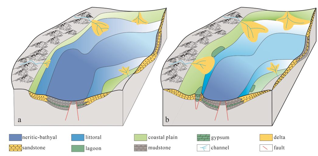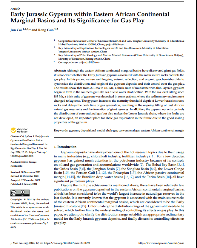 蔡俊副教授在《JMSE》上发表题为“Early Jurassic Gypsum within Eastern African Continental Marginal Basins and Its Significance for Gas Play”的研究论文。该研究通过基于钻测井和地震资料,结合地球化学数据,分析了转换型陆缘盆地膏盐岩分布特征、成因及其对油气分布的控制作用。研究结果显示在陆间裂谷期的海平面上升阶段,由于水体较深出现盐度分层作用导致薄层膏盐岩析出;随着海平面下降,在地堑控制的洼地形成潟湖环境,蒸发作用的加剧导致了厚层膏盐岩的形成。膏盐岩的发育提升了前转换期烃源岩成熟的阈值,导致大规模生排烃的迟滞,这或许是转换陆缘盆地巨型油气藏形成的重要原因之一。