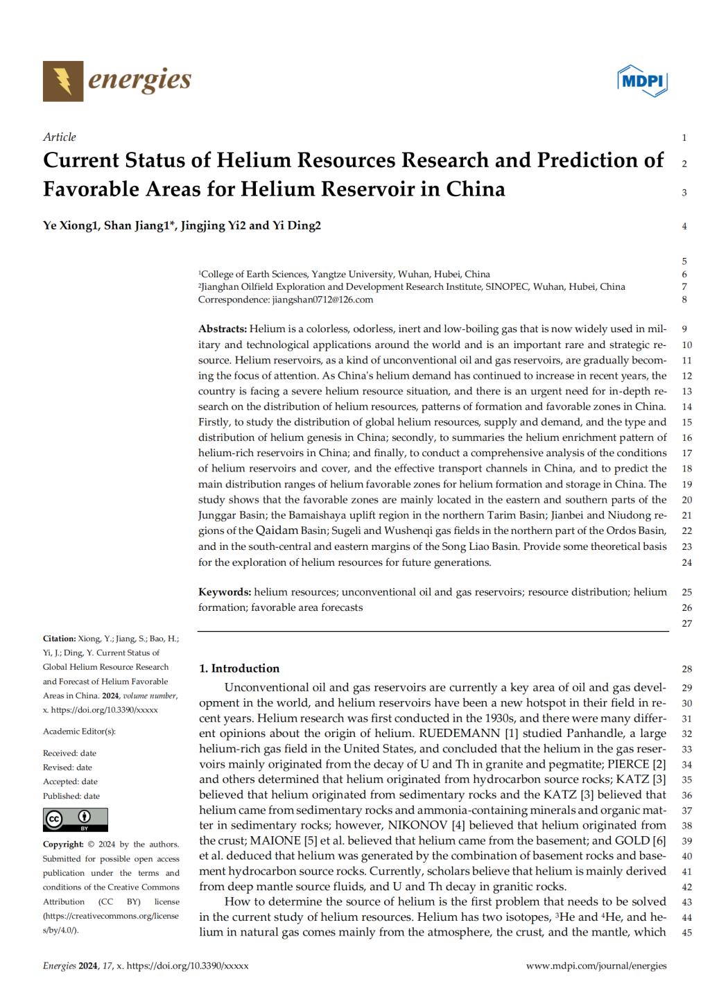 日本无码av 硕士生熊烨在《Energies》发表题为“Current Status of Helium Resources Research and Prediction ofFavorable Areas for Helium Reservoir in China”的研究论文。日本无码av 为论文第一署名单位,硕士生熊烨为论文第一作者,教师江山为通讯作者。