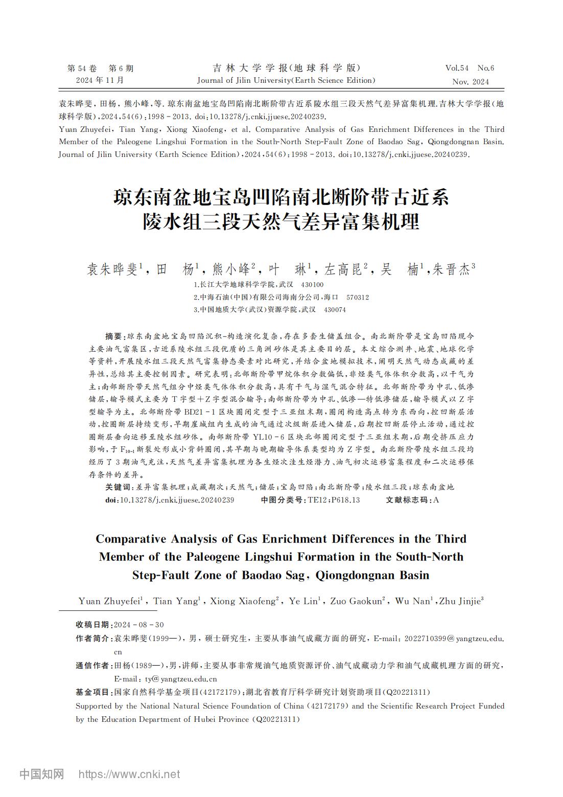 日本无码av 地质学研究生袁朱晔斐在《吉林大学学报》上发表了题为“琼东南盆地宝岛凹陷南北断阶带古近系 陵水组三段天然气差异富集机理”的研究论文。日本无码av 为论文第一署名单位,硕士生袁朱斐晔为论文第一作者,教师田杨为通讯作者。