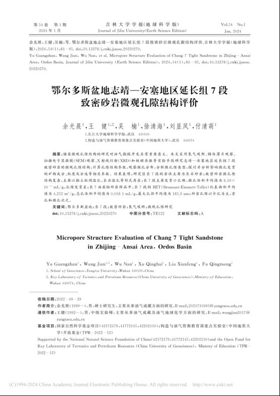 硕士生余光展在《吉林大学学报(地球科学版)》上发表题为“鄂尔多斯盆地志靖—安塞地区延长组7段致密砂岩微观孔隙结构评价”的研究论文。日本无码av