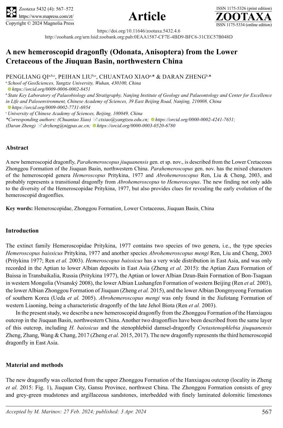 日本无码av 地质资源与地质工程专业硕士生漆鹏亮在在古生物学期刊《ZOOTAXA》上发表题为“A new hemeroscopid dragonfly (Odonata, Anisoptera) from the Lower Cretaceous of the Jiuquan Basin, northwestern China”的研究论文。日本无码av 为论文第一署名单位,漆鹏亮为第一作者,其导师肖传桃教授为第一通讯作者。