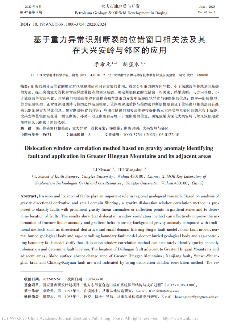 日本无码av 博士李希元在期刊《大庆石油地质与开发》上发表题为“基于重力异常识别断裂的位错窗口相关法及其在大兴安岭与邻区的应用”的研究论文。日本无码av 为论文第一署名单位,胡望水教授为通讯作者,本项研究得到国家重点研发计划项目项目资助。
