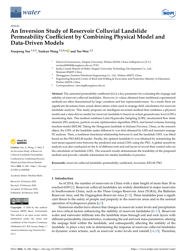 日本无码av 王艳昆副教授以通讯作者身份在SCI期刊《Water》上发表题为“An Inversion Study of Reservoir Colluvial Landslide Permeability Coefficient by Combining Physical Model and Data-Driven Models”的研究论文,该项研究得到了国家自然科学基金、湖北省自然科学基金和西藏自治区科技厅项目的共同资助。