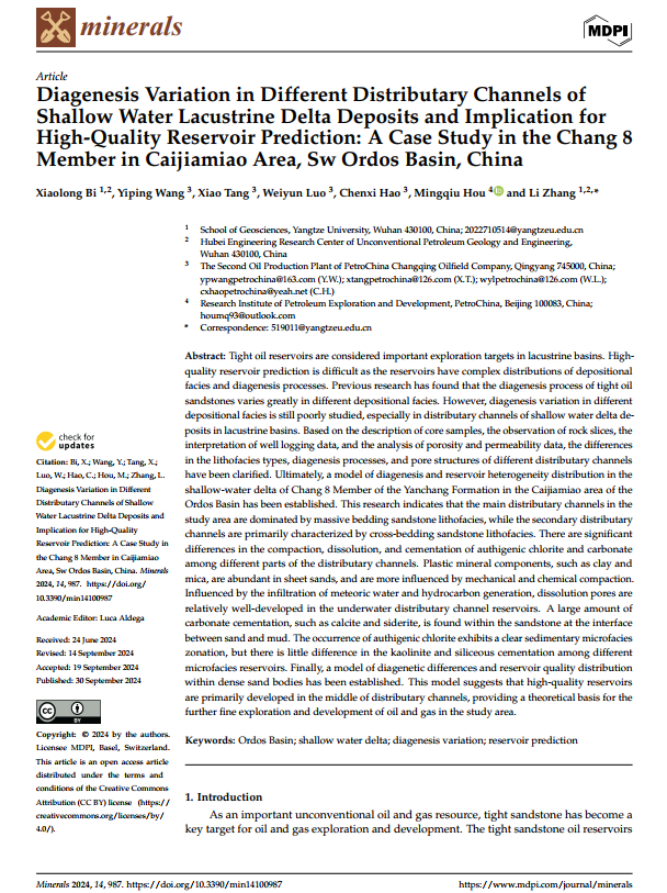 地科院硕士生毕小龙在张莉副教授的指导下,在期刊《Minerals》上发表题为《Diagenesis Variation in Different Distributary Channels of Shallow Water Lacustrine Delta Deposits and Implication for High-Quality Reservoir Prediction: A Case Study in the Chang 8 Member in Caijiamiao Area, Sw Ordos Basin, China》的研究论文,日本无码av 为论文第一署名单位,硕士生毕小龙为论文第一作者,其导师张莉副教授为该文通讯作者。