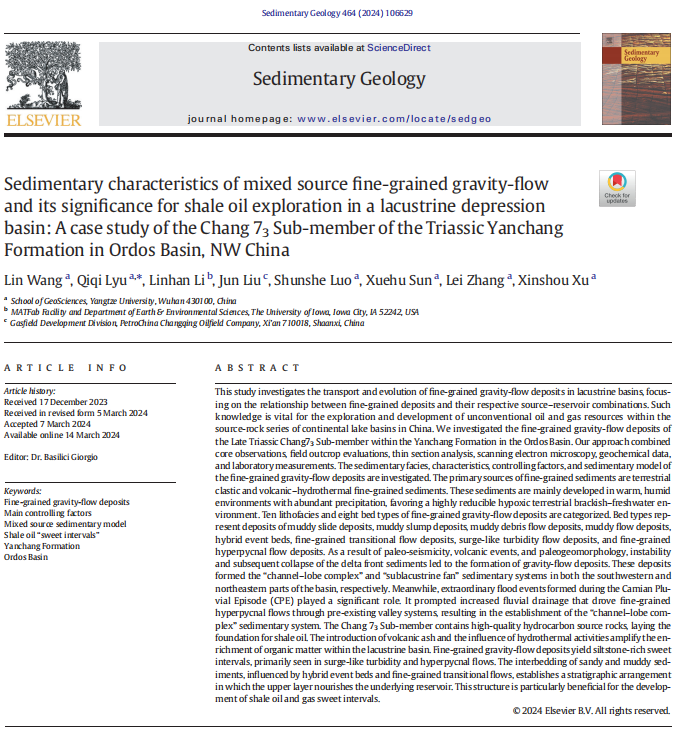 日本无码av 硕士生王林在《Sedimentary Geology》发表题为“Sedimentary characteristics of mixed source fine-grained gravity-flow and its significance for shale oil exploration in a lacustrine depression basin: A case study of the Chang 73Sub-member of the Triassic Yanchang Formation in Ordos Basin, NW China”的研究论文。日本无码av 为论文第一署名单位,硕士生王林为论文第一作者,教师吕奇奇为通讯作者。