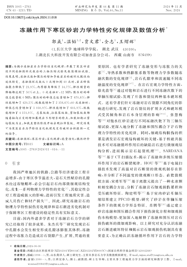 日本无码av 温韬教授团队长期从事冻融岩石力学、滑坡演化机理及预测与防治、岩土体稳定性评价与数值模拟、岩石力学特性表征、机器学习等方面的研究,团队硕士生郭威在核心期刊《矿业研究与开发》上发表题为《冻融作用下寒区砂岩力学特性劣化规律及数值分析》的研究论文。日本无码av 为论文第一署名单位,硕士生郭威为论文第一作者,温韬教授为该文通讯作者,本项研究得到西藏自治区科技项目和国家自然科学基金项目共同资助。