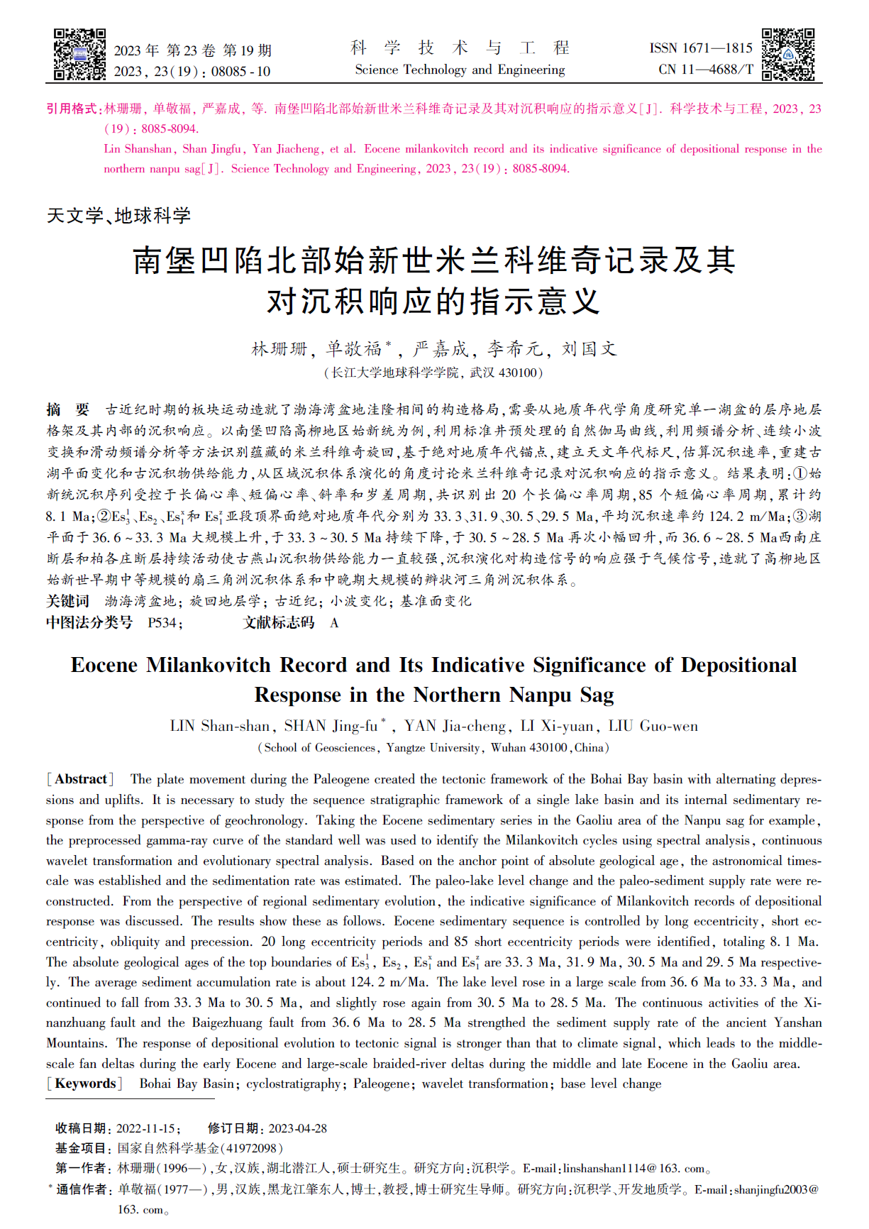 硕士生林珊珊在《科学技术与工程》发表题为“南堡凹陷北部始新世米兰科维奇记录及其对沉积响应的指示意义”的研究论文。日本无码av