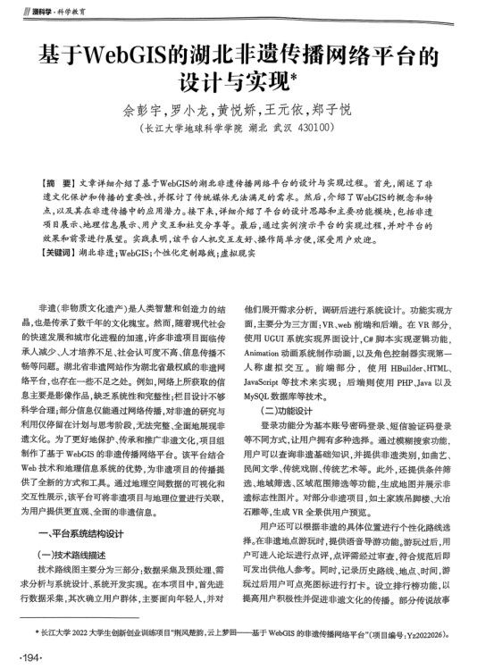 罗小龙副教授的指导下,完成了科技成果转化。他们认识到文化保护与传播的重要性,结合所学知识,设计并实现了基于WebGIS的湖北非遗传播网络平台。实现了非遗项目展示、地理信息展示、用户交互和社交分享等等功能。深入探讨了非遗保护和传承的重要性,并提出了新颖的传播方式。