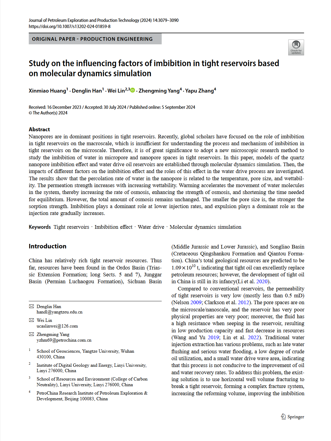 日本无码av 硕士研究生章黄鑫淼在《Journal of Petroleum Exploration and Production Technology》发表了题为“Study on the influencing factors of imbibition in tight reservoirs based on molecular dynamics simulation”的研究论文,日本无码av 为论文第一署名单位,黄鑫淼为论文第一作者,韩登林教授、林伟老师、杨正明老师共同为该文通讯作者。