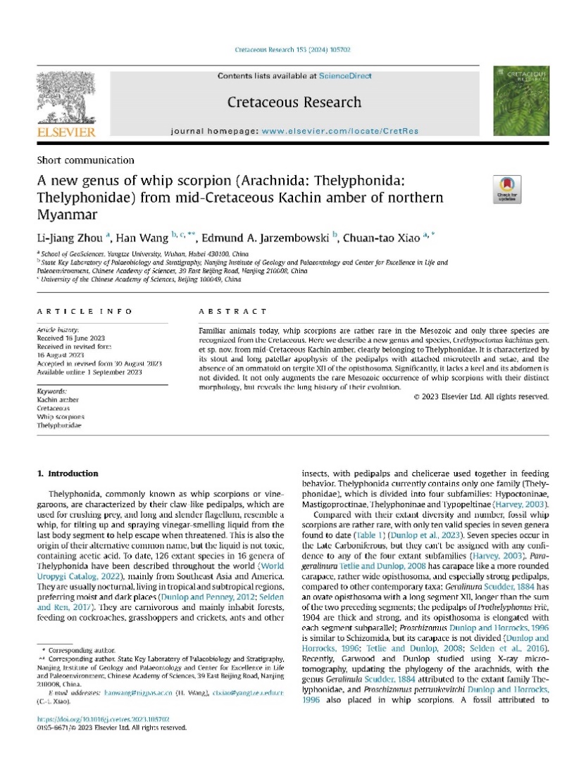 日本无码av 硕士周利将在地球科学与古生物学领域期刊《Cretaceous Research》上发表题为“A new genus of whip scorpion (Arachnida: Thelyphonida: Thelyphonidae) from mid-Cretaceous Kachin amber of northern Myanmar”的研究论文。日本无码av 为论文第一署名单位,周利将为第一作者,其导师肖传桃教授为第一通讯作者。
