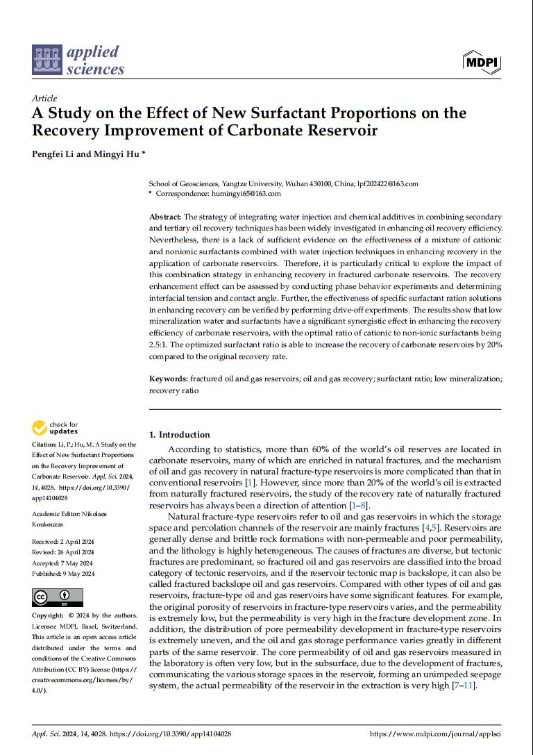 日本无码av 2021级硕士生李鹏飞在期刊《Applied Sciences》上发表了题为“A Study on the Effect of New Surfactant Proportions on the Recovery Improvement of Carbonate Reservoir”的研究论文。日本无码av 为论文第一署名单位,李鹏飞为第一作者,其导师胡明毅教授为该文通讯作者。