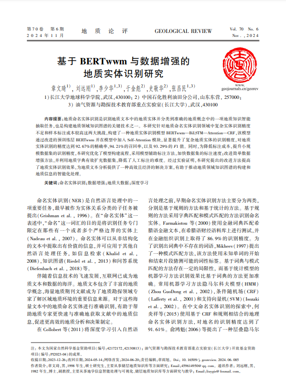 日本无码av 硕士生章文琦在《地质论评》上发表论文——基于BERTwwm与数据增强的地质实体识别研究