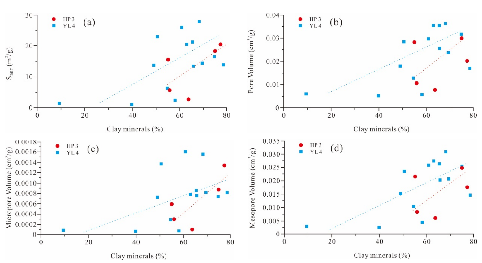 为此,本研究对黔西地区龙潭组低成熟度页岩孔隙发育特征进行了系统的研究。结果显示,黔西地区龙潭组泥页岩孔隙类型包括粒间孔、粒内孔、有机质孔和微裂缝。黏土矿物相关孔是最主要的孔隙类型,有机质孔发育程度差。泥页岩孔隙以中孔为主,宏孔次之,孔径直径在1nm-100nm,具有多峰型特点。比表面积主要由孔径在5nm-10nm孔隙所提供,泥页岩孔隙孔径越小,对比表面积贡献越大,越有利于页岩气吸附聚集。黏土矿物含量是控制泥页岩微-纳米级孔隙发育和比表面积的最重要内因,其中伊蒙混层的控制作用最为明显,但黏土矿物含量过低或过高均不利于宏孔的发育。总有机碳含量、脆性矿物含量和碳酸盐岩矿物含量均不利于孔隙发育和比表面积。热成熟度对非有机质孔隙体积和比表面积控制作用不明显。