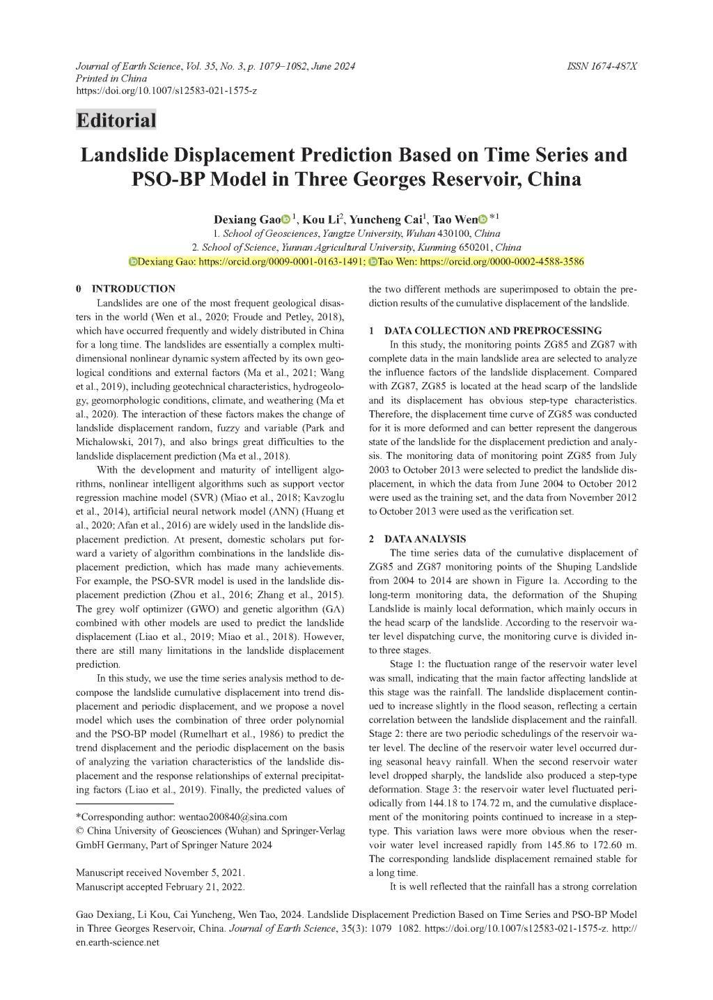日本无码av 温韬副教授团队长期从事极端条件下滑坡灾害演化机理、预测及防治方面的研究,指导本科生高德祥在综合性地学学术2区期刊《Journal of Earth Science》上发表题为“Landslide Displacement Prediction Based on Time Series and PSO-BP Model in Three Georges Reservoir, China”的研究论文。日本无码av 为论文第一署名单位,本科生高德祥为论文第一作者,温韬副教授为该文通讯作者,本项研究得到国家自然科学基金项目、非常规油气协同创新中心、湖北省爆破工程重点实验室开放基金项目共同资助。