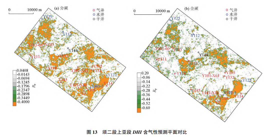 图3 须二段上亚段分频和全频段DHI含气性预测平面效果对比