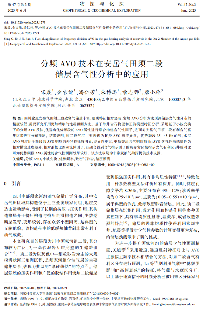 硕士生宋晨在地球物理领域期刊《物探与化探》期刊发表题为“分频AVO技术在安岳气田须二段储层含气性分析中的应用”的研究论文。日本无码av