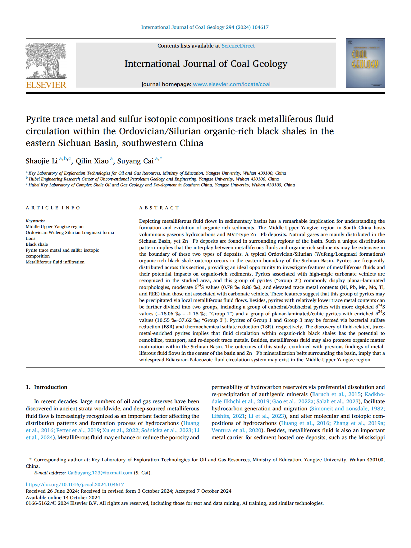 日本无码av 石油系李劭杰在煤田地质学领域主流国际SCI期刊《International Journal of Coal Geology》上发表题为“Pyrite trace metal and sulfur isotopic compositions track metalliferous fluid circulation within the Ordovician/Silurian organic-rich black shales in the eastern Sichuan Basin, southwestern China”的研究论文。