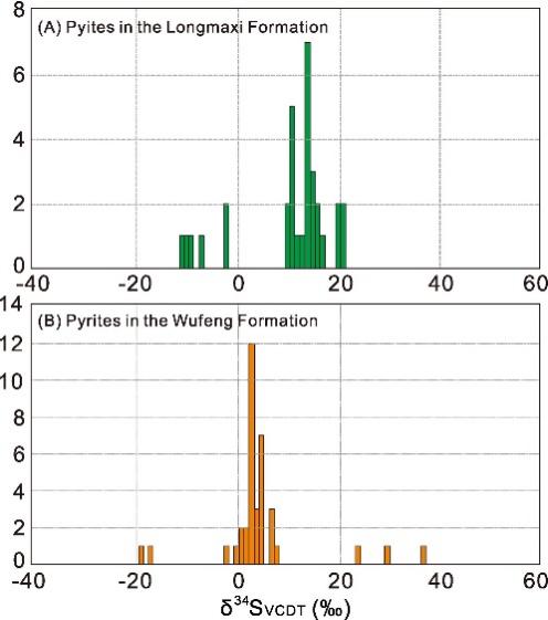 图1(A) 龙马溪组黄铁矿原位S同位素组成分布特征; (B) 五峰组黄铁矿原位S同位素组成分布特征.
