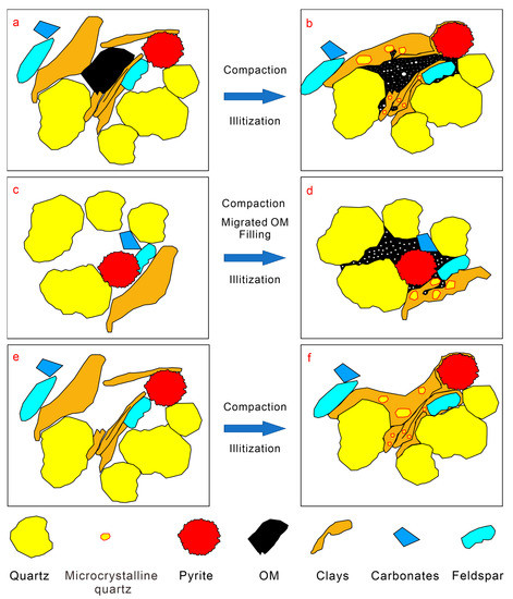 图2有机质保存孔隙的机理:(1)有机质作为沉积物骨架的一部分原位沉积;(b)韧性矿物,如粘土和有机质,在压实过程中发生变化,次生孔隙和微晶石英在成岩过程中形成;(c)无有机质沉积的矿物;(d)与有机质充填有关的层间孔隙,以及在成岩过程中形成并由有机质保存的次生孔隙;(e)沉积有较高粘土但无有机质的矿物;(f)在压实过程中被压实的粘土,孔隙被破坏。