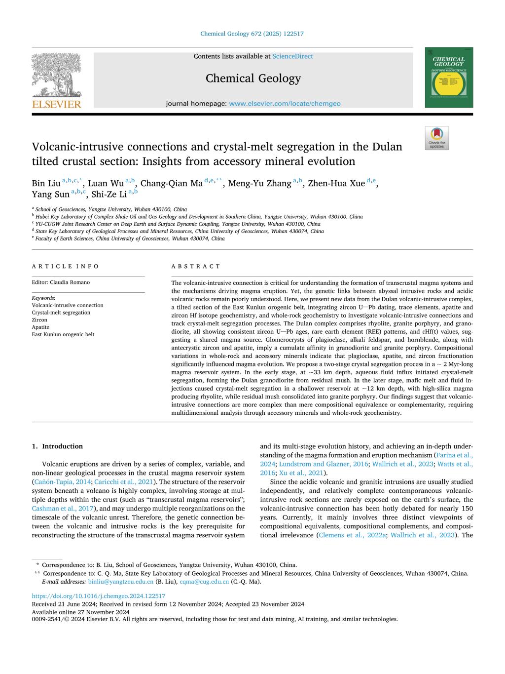 日本无码av 刘彬教授团队在地学TOP期刊《Chemical Geology》上发表了题为“Volcanic-intrusive connections and crystal-melt segregation in the Dulan tilted crustal section: Insights from accessory mineral evolution”的研究论文。刘彬教授为第一作者和通讯作者,该项研究得到了国家自然科学基金等项目资助。