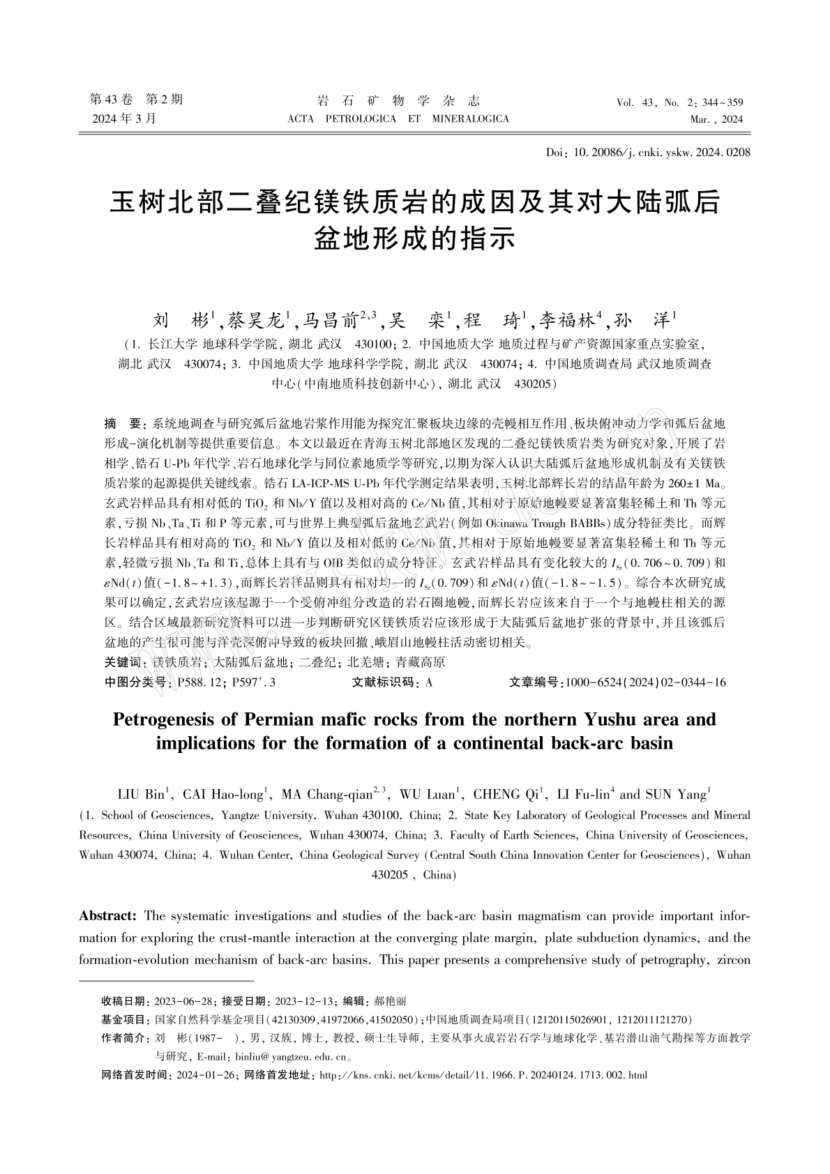 论文链接:刘彬,蔡昊龙,马昌前,吴栾,程琦,李福林,孙洋, 2024.玉树北部二叠纪镁铁质岩的成因及其对大陆弧后盆地形成的指示.岩石矿物学杂志, 43(2): 344-359.DOI:10.20086/j.cnki.yskw.2024.0208