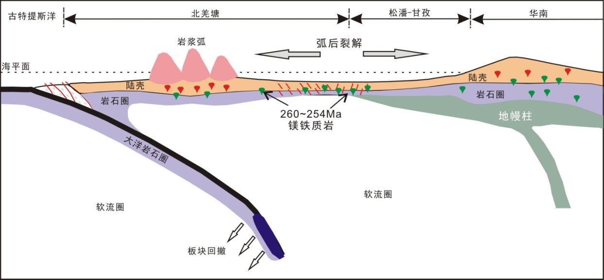 锆石LA-ICP-MS U-Pb年代学测定结果表明,玉树北部辉长岩的结晶年龄为260±1 Ma。玄武岩样品具有相对低的TiO2和Nb/Y值以及相对高的Ce/Nb值,其相对于原始地幔要显著富集轻稀土和Th等元素,亏损Nb、Ta、Ti和P等元素,可与世界上典型弧后盆地玄武岩(例如Okinawa Trough BABBs)成分特征类比。而辉长岩样品具有相对高的TiO2和Nb/Y值以及相对低的Ce/Nb值,其相对于原始地幔要显著富集轻稀土和Th等元素,轻微亏损Nb、Ta和Ti,总体上具有与OIB类似的成分特征。玄武岩样品具有变化较大的Isr(0.706~0.709)和εNd(t)值(-1.8~+1.3),而辉长岩样品则具有相对均一的Isr(0.709)和εNd(t)值(-1.5~-1.8)。综合本次研究成果可以确定,玄武岩应该起源于一个受俯冲组分改造的岩石圈地幔,而辉长岩应该来自于一个与地幔柱相关的源区。结合区域最新研究资料可以进一步判断研究区镁铁质岩应该形成于大陆弧后盆地扩张的背景中,并且该弧后盆地的产生很可能与洋壳深俯冲导致的板块回撤、峨眉山地幔柱活动密切相关(图2)。