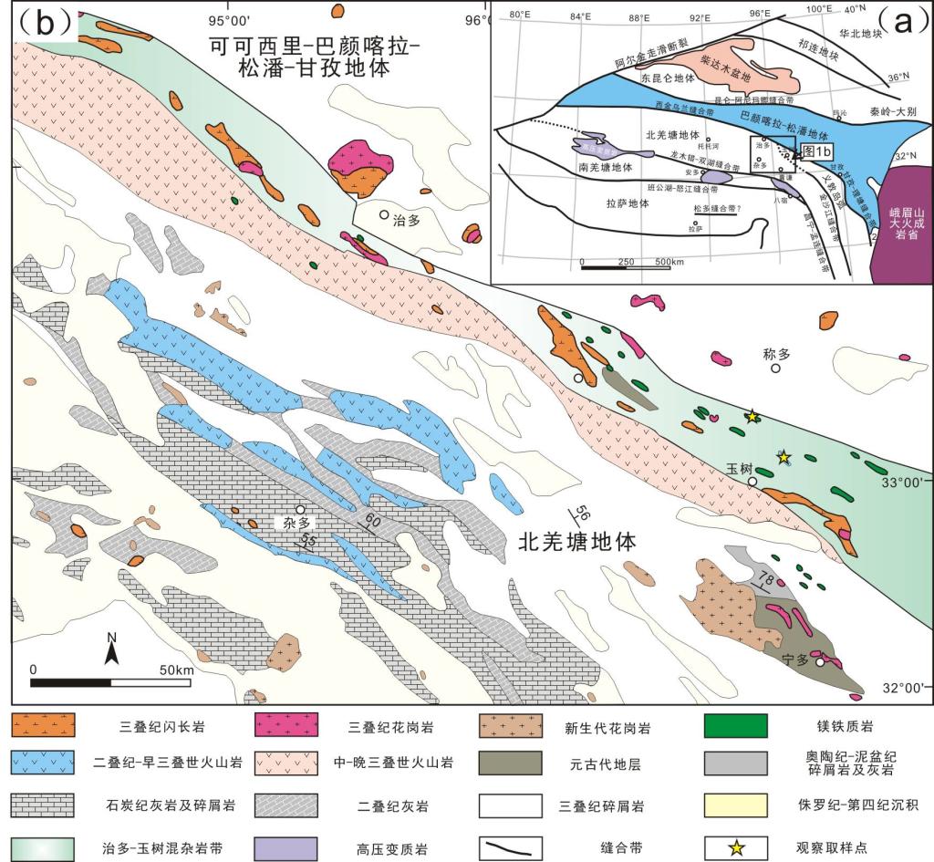 系统地调查与研究弧后盆地岩浆作用能为探究汇聚板块边缘的壳幔相互作用、板块俯冲动力学和弧后盆地形成-演化机制等提供重要信息。该研究以在青海玉树北部地区发现的二叠纪镁铁质岩类为研究对象(图1),开展了岩相学、锆石U-Pb年代学、岩石地球化学与同位素地质学等研究,以期为深入认识大陆弧后盆地形成机制及有关镁铁质岩浆的起源提供关键线索。