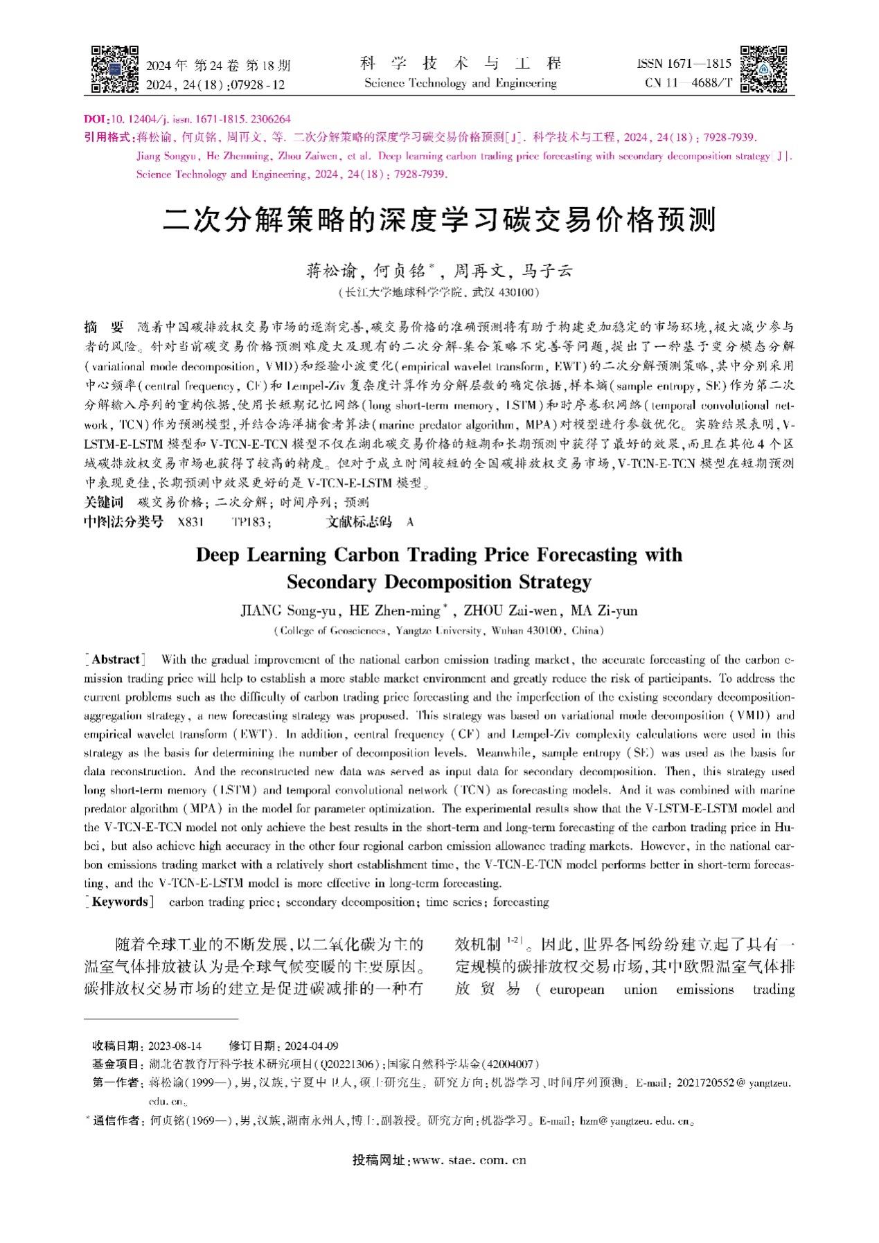 日本无码av 何贞铭副教授团队长期从事GIS、RS应用的研究,团队成员蒋松渝在中文核心期刊《科学技术与工程》上发表题为“二次分解策略的深度学习碳交易价格预测”的研究论文。日本无码av 为论文第一署名单位,硕士研究生蒋松渝为论文第一作者,其导师何贞铭副教授为该文通讯作者。在导师严格要求及编辑耐心帮助下取得该成果。
