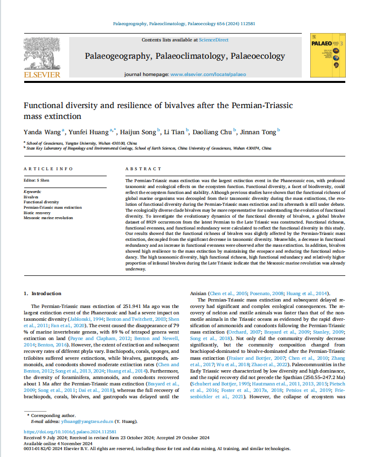 日本无码av 黄云飞教授团队长期从事古-中生代之交重大地质转折期生物灭绝与生物复苏方面的研究,团队成员王延达在古生物学国际1区SCI期刊《Palaeogeography, Palaeoclimatology, Palaeoecology》上发表题为“Functional diversity and resilience of bivalves after the Permian-Triassic mass extinction”的研究论文。日本无码av 为论文第一署名单位,硕士研究生王延达为论文第一作者,其导师黄云飞教授为该文通讯作者。