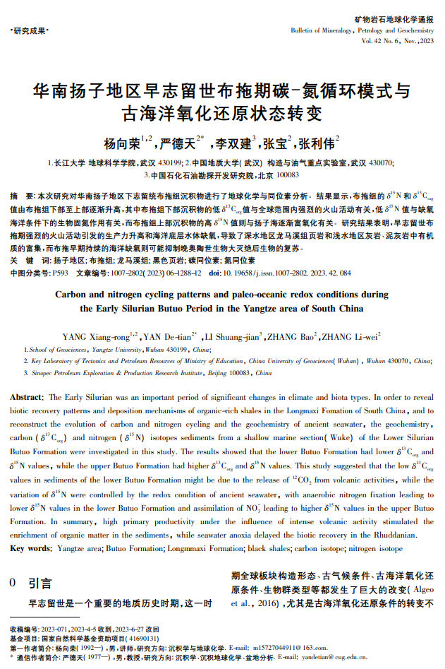 日本无码av 地质系教师杨向荣在地学核心期刊《矿物岩石地球化学通报》上发表题为“华南扬子地区早志留世布拖期碳-氮循环模式与古海洋氧化还原状态转变”的研究论文。