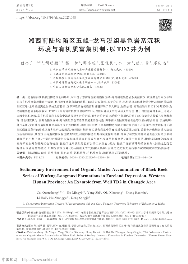 日本无码av 地质系教师蔡全升博士在《地球科学》上发表了题为“湘西前陆坳陷区五峰‒龙马溪组黑色岩系沉积环境与有机质富集机制:以TD2井为例”的研究论文。