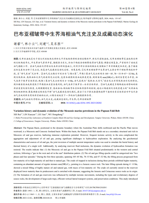 林小云教授的指导下,在地质学领域期刊《海洋地质与第四纪地质》上发表题为“巴布亚褶皱带中生界海相油气充注史及成藏动态演化”的研究论文。