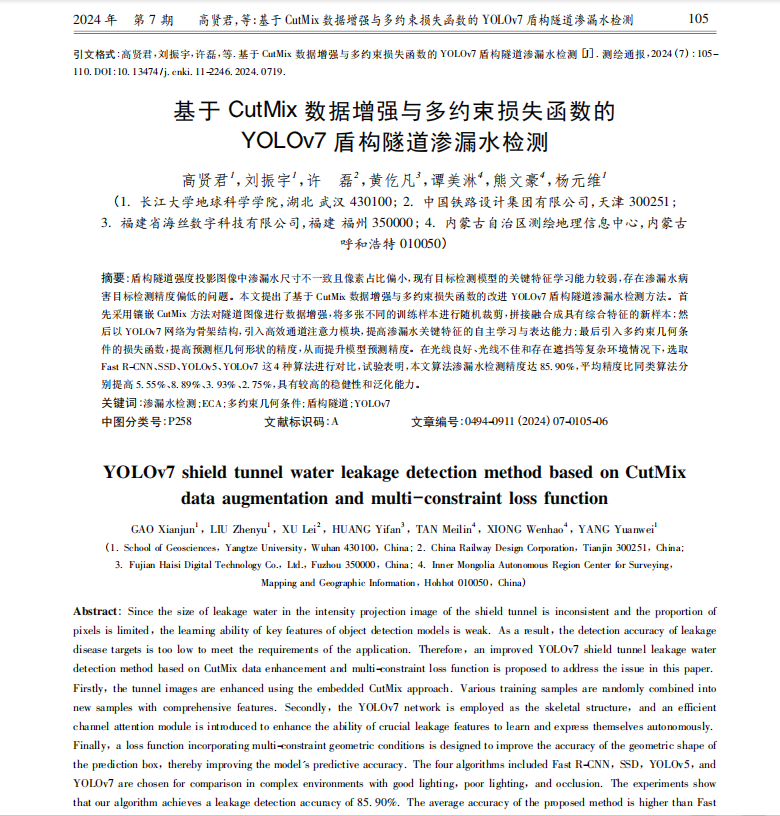 日本无码av 地信系高贤君老师在测绘领域主流期刊《测绘通报》上发表题为“基于Cutmix数据增强与多约束损失函数的YOLOv7盾构隧道渗漏水检测”的研究论文。