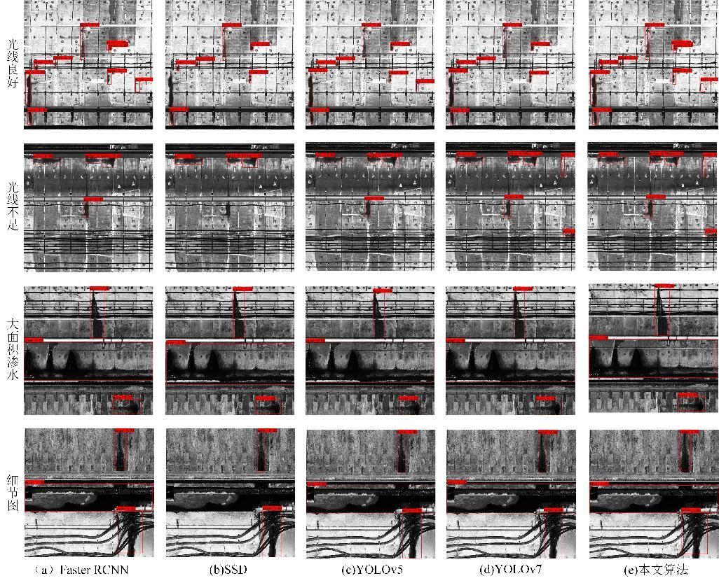 该研究主要针对盾构隧道强度投影图像中渗漏水尺寸不一致且像素占比偏小,现有目标检测模型的关键特征学习能力较弱,存在渗漏水病害目标检测精度偏低。因此,本文提出了基于CutMix数据增强与多约束损失函数的改进YOLOv7盾构隧道渗漏水检测方法(图1)。首先采用镶嵌CutMix方法对隧道图像进行数据增强,将多张不同的训练样本进行随机裁剪,拼接融合成具有综合特征的新样本;然后以YOLOv7网络为骨架结构,引入高效通道注意力模块,提高渗漏水关键特征的自主学习与表达能力;最后引入多约束几何条件的损失函数,提高预测框几何形状的精度,从而提升模型预测精度。在光线良好、光线不佳和存在遮挡等复杂环境情况下,选取Fast R-CNN、SSD、YOLOv5、YOLOv7这4种算法进行对比(图2),试验表明,本文算法渗漏水检测精度达85.90%,该方法在具有多干扰、遮挡的复杂隧道环境中进行综合渗漏水病害检测具有较好的应用前景。