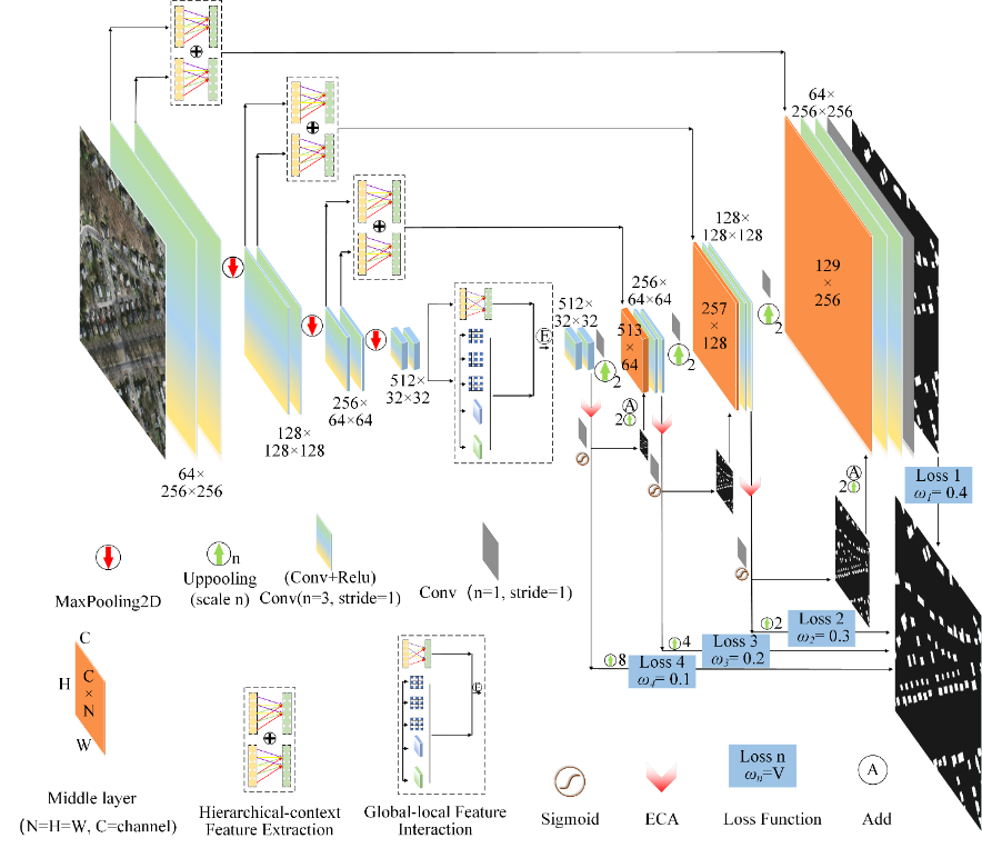 该研究主要针对在一些复杂的场景中,当建筑物及其邻近地物的特征相似时,现有的分割模型无法有效区分。因此,提出了一种复杂场景自适应网络(CSA-Net)用于建筑提取。CSA-Net(图1)由层次上下文特征提取(HFE)模块、全局-局部特征交互(GFI)模块和多尺度自适应特征融合(MFF)结构组成。HFE获取不同层次的高级语义信息,并通过跳过连接的方式将其与低级细节信息融合,增强复杂场景中建筑结构的推理和感知能力。在Google Arlinton, WHU和Massachusetts建筑数据集上视觉对比结果表明,该方法可以提高复杂场景下建筑物提取的精度(图2)。